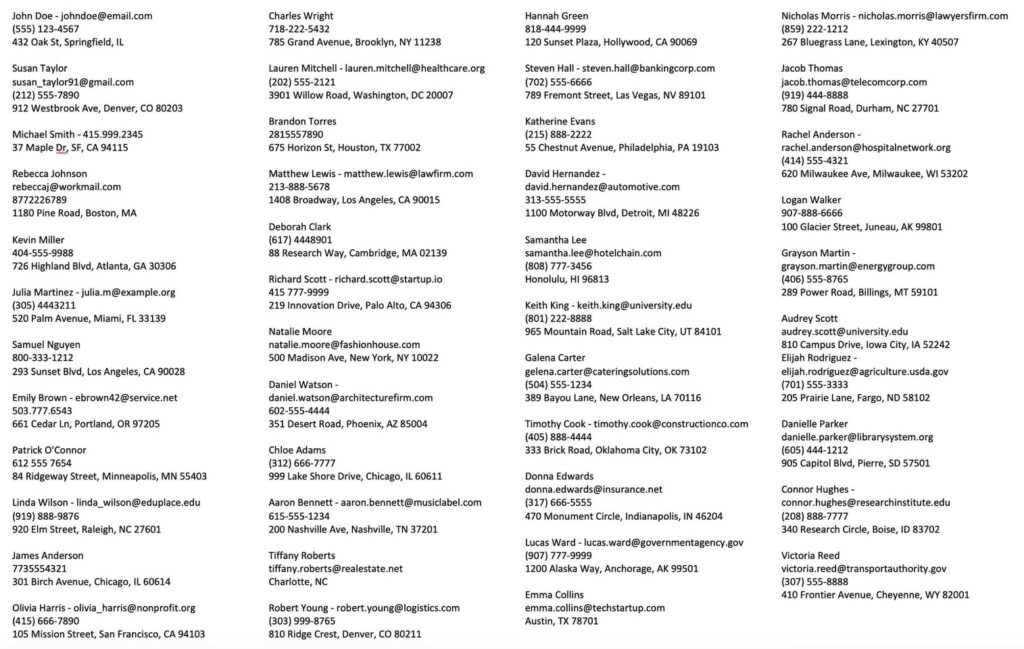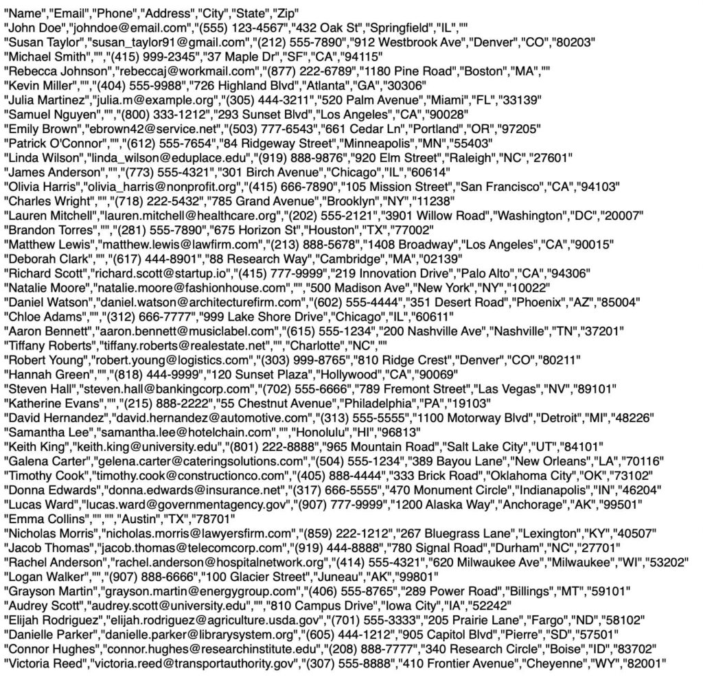 Input: 48 contact records in inconsistent formats. Some include email addresses, others don’t. Phone number formatting varies (parentheses, dashes, periods, spaces). Address components are sometimes on one line, sometimes split across multiple lines. State names appear as both abbreviations and full names.